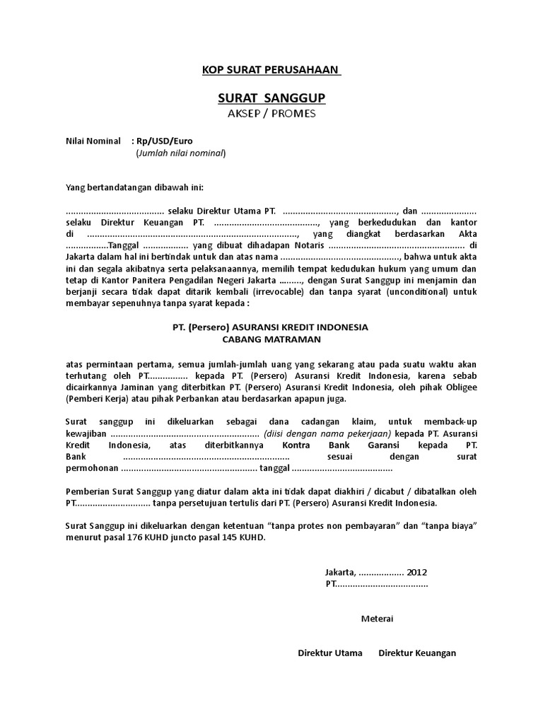 Pengertian Surat Sanggup : 2. Surat sanggup bayar atau biasa juga disebut surat promes atau promes yang dalam bahasa inggris disebut juga promissory note, dalam akuntansi dapat juga disebut nota yang dapat diuangkan adalah suatu kontrak yang berisikian janji secara terinci dari suatu pihak ( pembayar). Pengertian, tujuan, manfaat, dan contoh suratnya. Untuk memberikan kepercayaan bagi pihak yang bersangkutan, surat pernyataan kesanggupan menjadi. Oleh ilmu ekonomi id posting komentar. Promes berbeda dari surat pengakuan hutang biasa dimana dalam surat pengakuan hutang hanya merupakan bukti atas.
